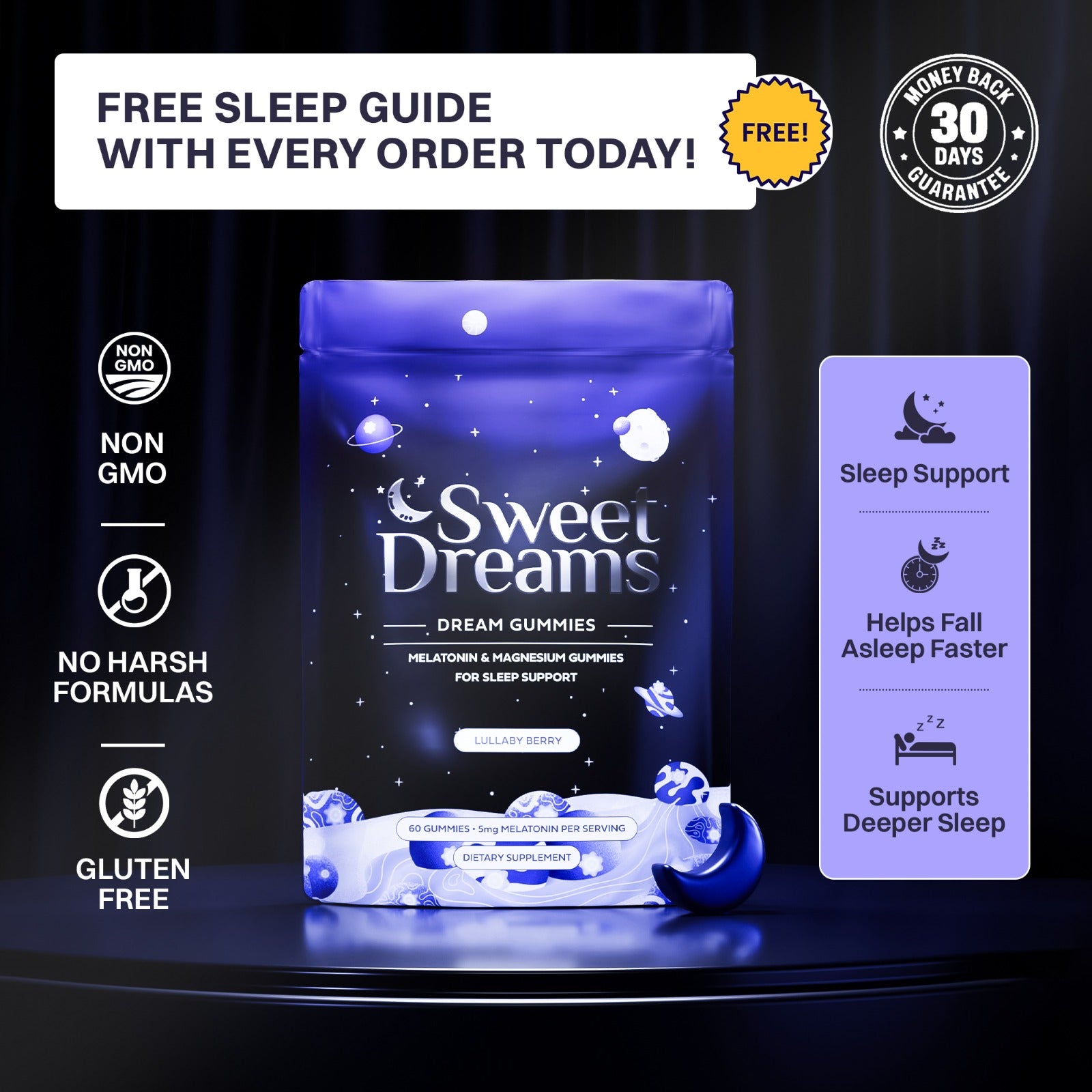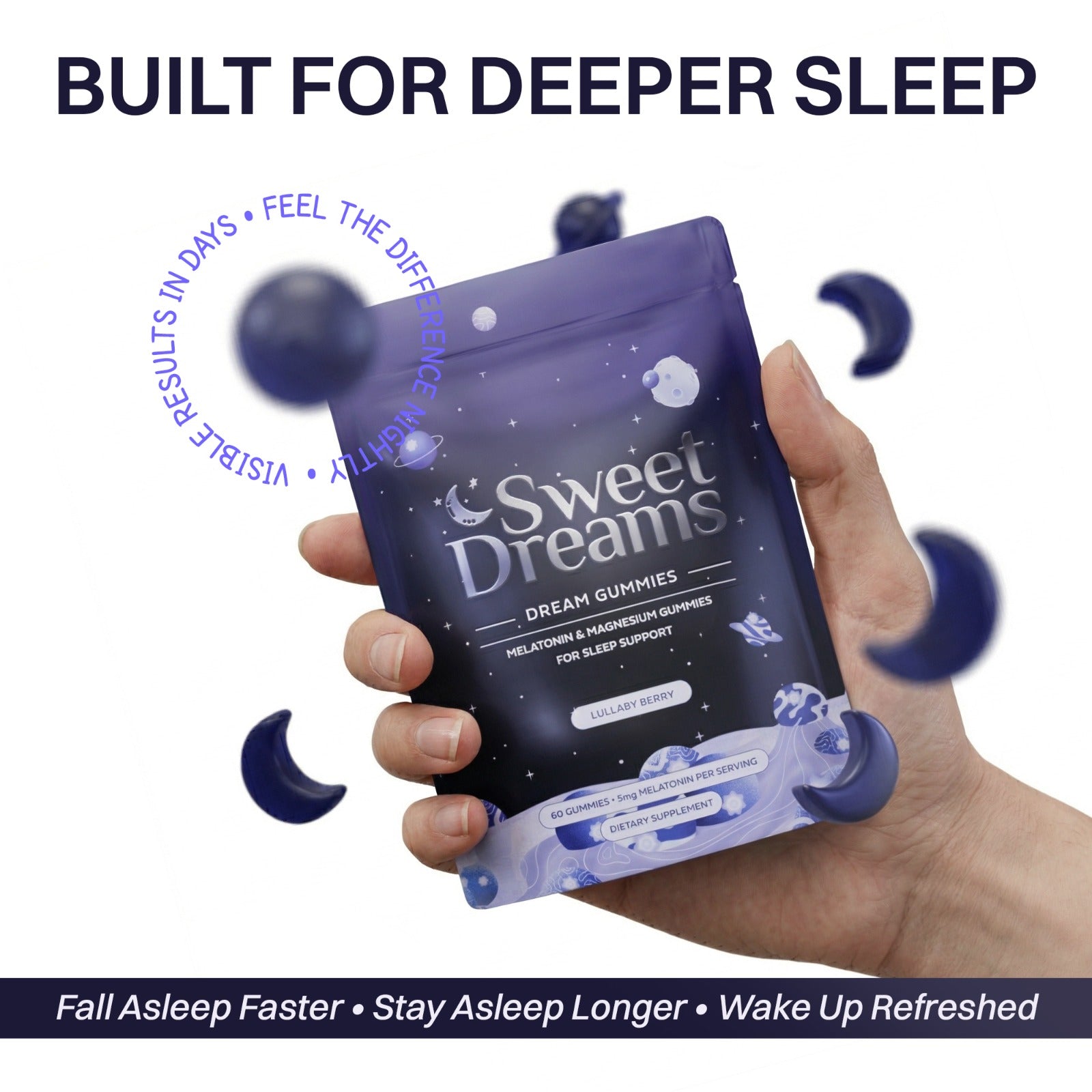 In the short term, Sweet Dreams helps you fall asleep faster and relaxes your mind and body before bedtime. As you take Sweet Dreams for one month, you’ll notice that you’re sleeping through the night and will feel more refreshed when you wake up.
