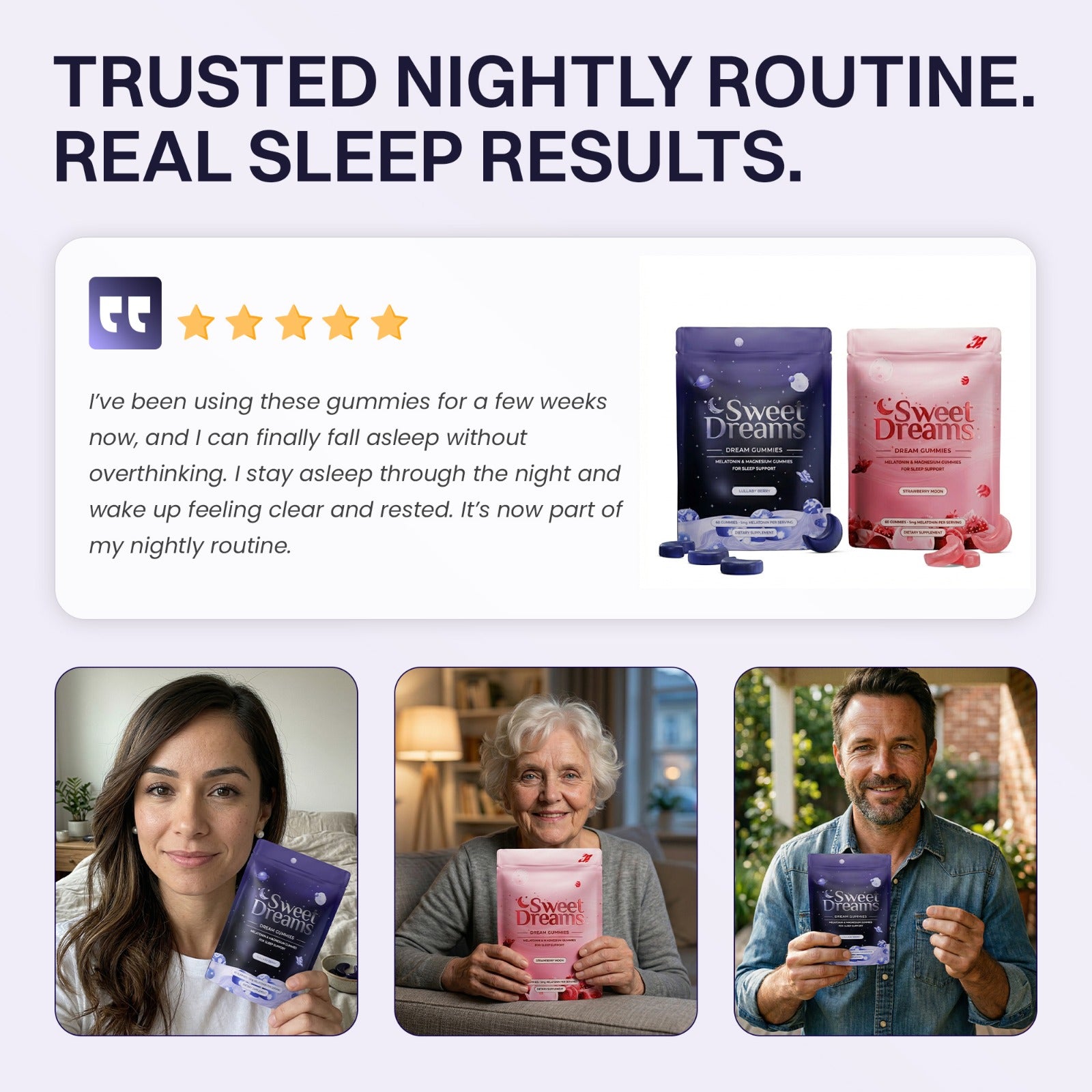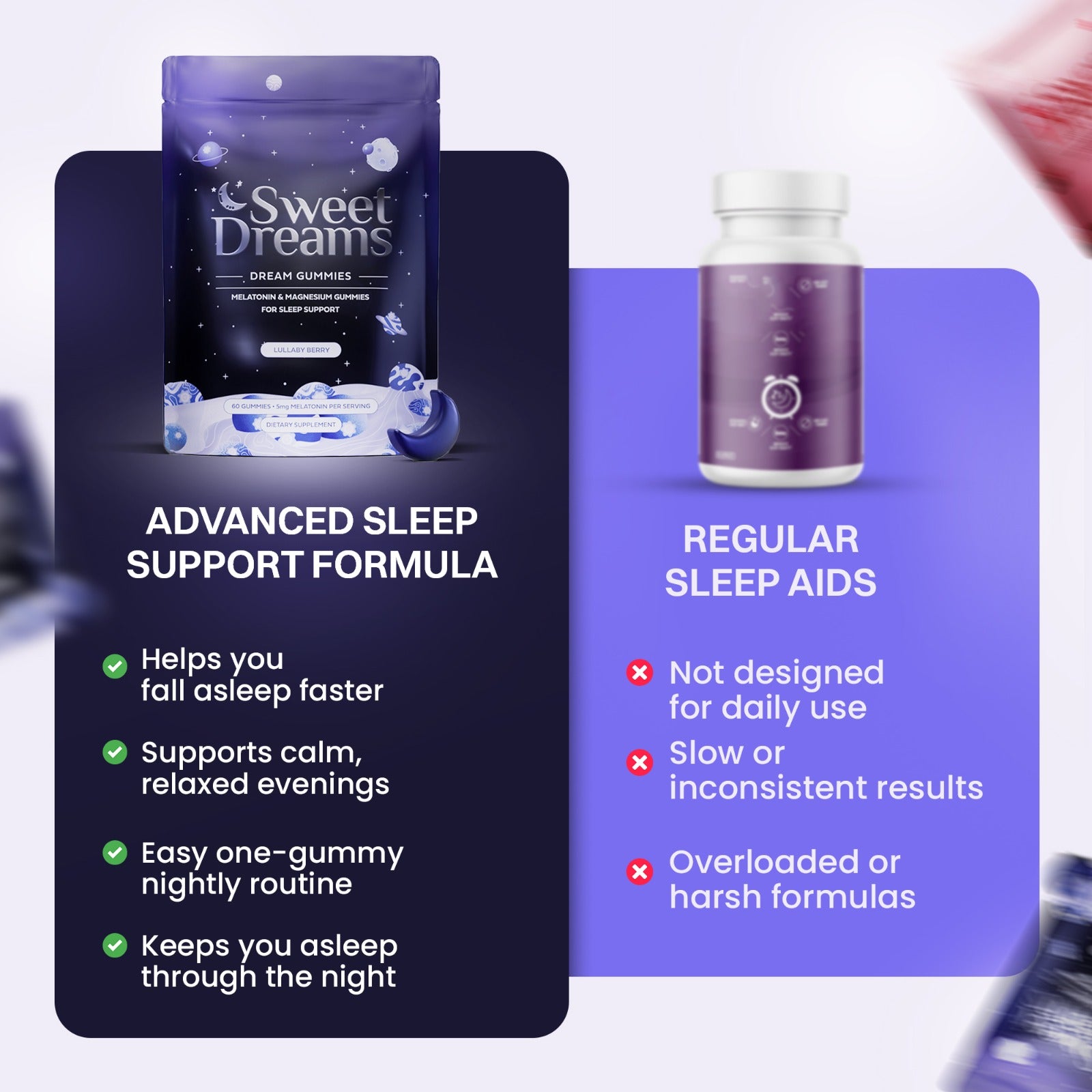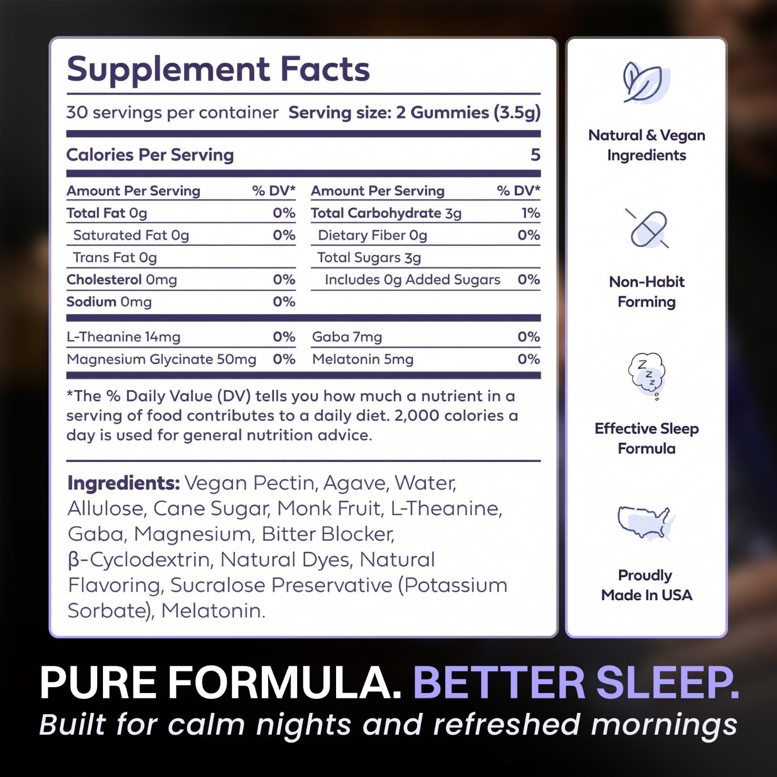 A clean, nighttime sleep gummy formulated with plant based to help calm your mind, relax your body, and support deep, restorative sleep — without next-day grogginess.